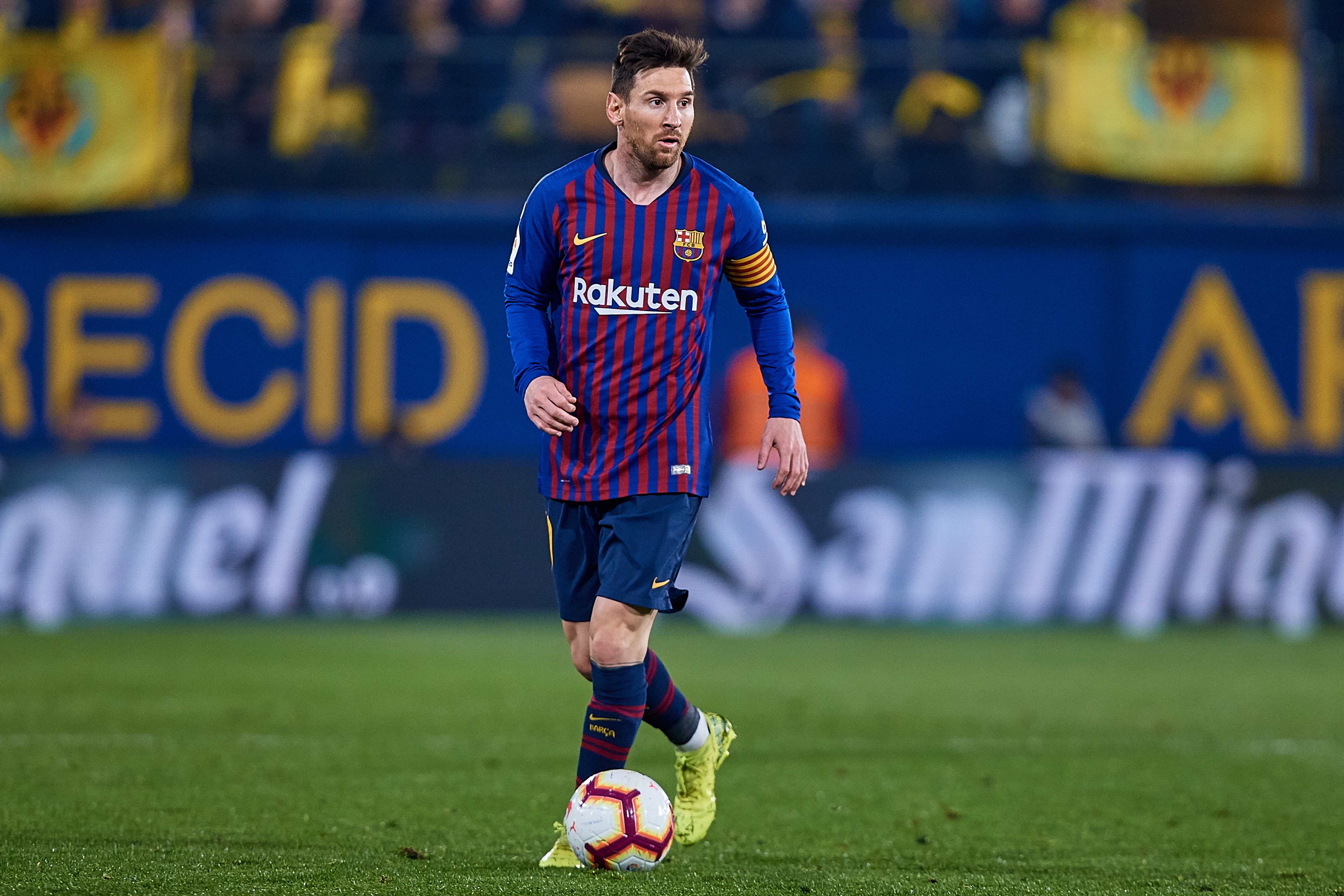 Lionel Messi Of Fc Barcelona Conducts The Ball Next To
