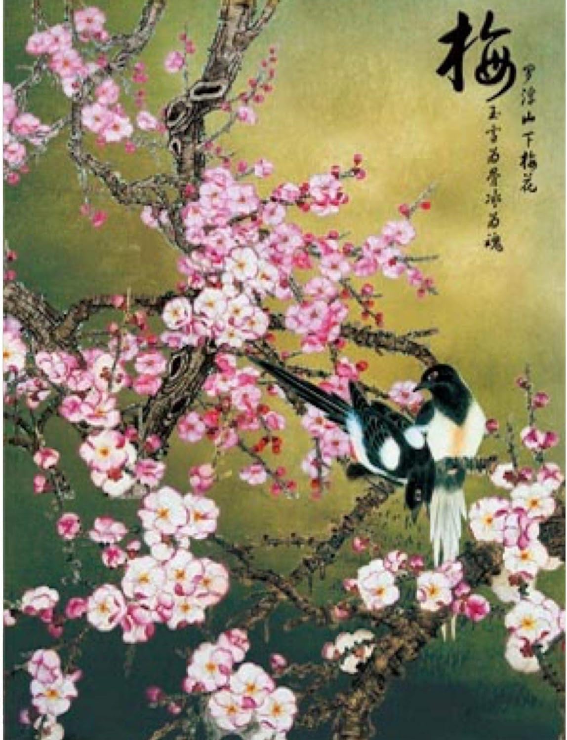 Painting Of Bird And Cherry Blossoms Reminiscent Of Asian